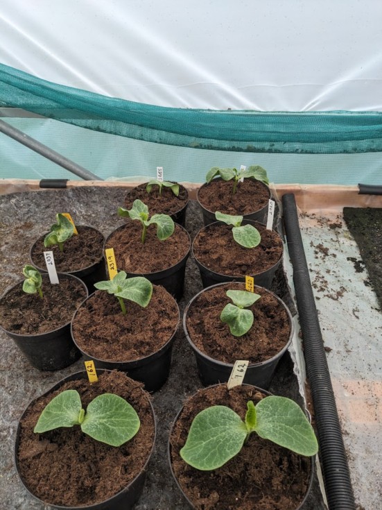 All plants are in the ground and doing well despite fairly wet and cloudy days. Here are the seedlings before they got planted out. Only the 2037 Crews looks a bit deformed.