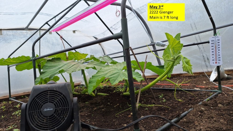 Finally!! May has arrived...but still a chilly 47F overcast day this morning. Kept it a toasty 80F inside the 15 ft long greenhouse with the heaters going, and running the Full Spectrum lights all day today. The 2222 Gienger main vine is 7 ft long.