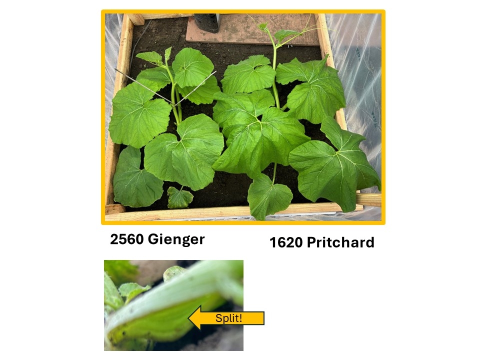 I need to decide which of these two plants to keep in the next couple days. The 2560 Gienger has a split in the stem where it folded over as it emerges from the ground. The 1620 Pritchard is perfect & a little more vigorous. The 2560 is what I was planning to grow here�but is it compromised??? What do you think? I'm asking for some bigpumpkins.com crowdsourcing advice here! I really am interested in your input, but ask that you to first take a look at my next couple diary entries which have the �stats� on the seeds these two plants were grown from.