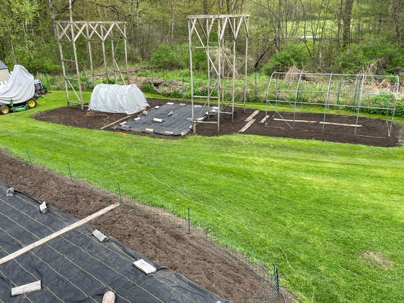 The old patch is ready to go as well but we need to wait closer to the last frost date before we plant the giant tomatoes and long gourds. Our weed control starts as soon as the ground is tilled. The weed block helps but we still spend a couple of hours each week with a stirrup hoe.