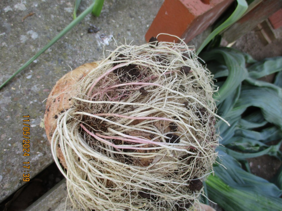 Pulled out a double Onion from NG bed and found start of 'Pink Root' looks like this will be a problem with others later on when we have even hotter conditions.