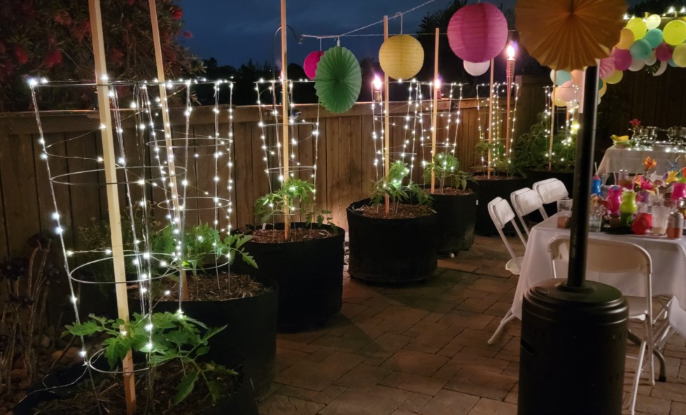 My daughter's 17.5 bday party was tonight. Late December bdays sux, cuz everyone is busy. So we celebrate later. To be a good sport, I put solar twinkly lights on my tomato cages. I just might keep them, lol.