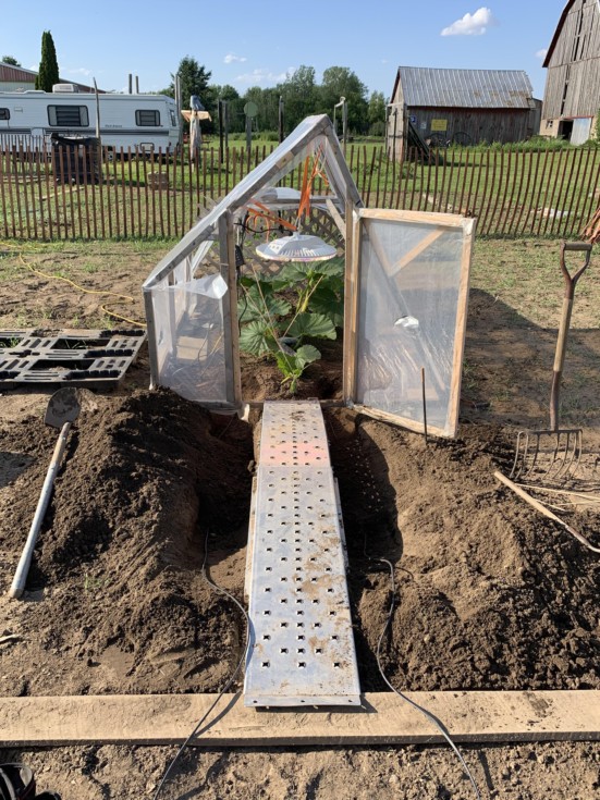 Finishing my second heating cable it's going down the main and loop back about 6� deep (1) spot plants need some help after picking one pumpkin off it's trying to grow suckers vines of the crown having to keep giving nitrogen products . I think blood meal would work really good if I had some , still need wind breaks also back up plant 2198 is ready to lay down