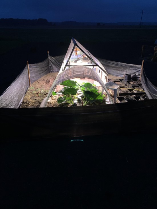 Wind breaks up but need more , cold and rainy may plug my cables back in I also feed them some jacks plant food and gel and buried vins with some seed coating that I got from Travis to see how it works , foliar sprayed Neptune fish and seaweed the patch has been tilled for the third time and seeded down with rye added shredded straw around the plants to help with the ground sealing , need to spray for bugs ! ASAP using baggies to hold down my main no coat hangers this year