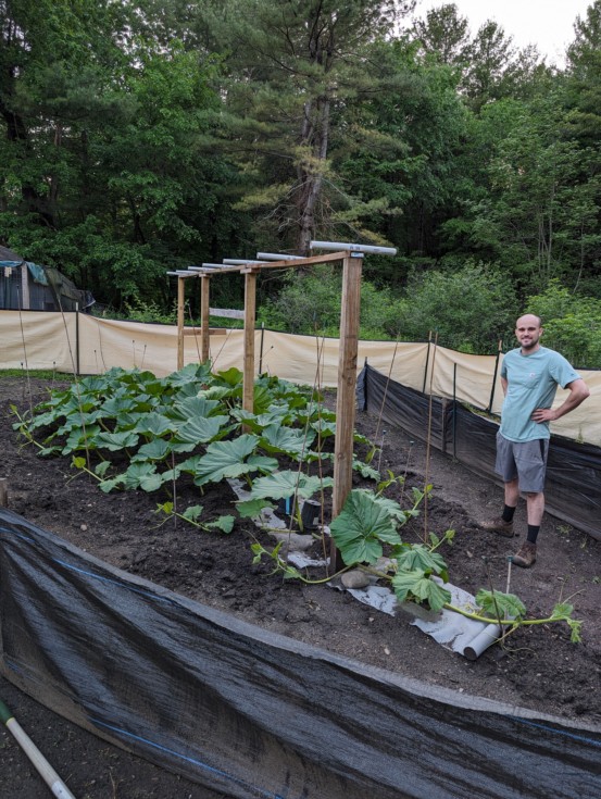 The 1832.5 Graham had been in the big greenhouse but it was getting too big and too hot so was removed last weekend. It's been rainy and cold for the past 2 days but the weather should get better. First main vine pumpkin is at around 16 ft. The one issue on the plant is that all older male flowers have wilted before maturing. Theory is the cause is environmental from heat and humidity of the greenhouse. The newer flowers are looking better.