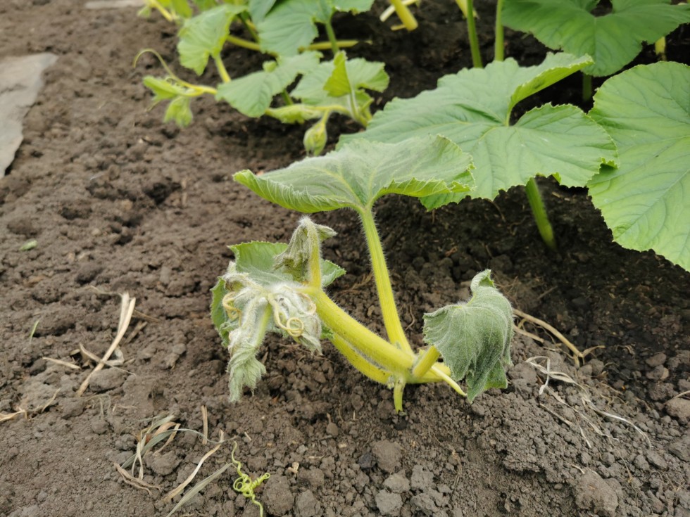 Something happened today that I didn't expect. Another freeze. Although the weather forecast did not suggest frosts. That's why I didn't want to cover the pumpkins. But at the last moment, late in the evening, I decided to hedge my bets and covered it. When I woke up in the morning, I found that all the grass was white with ice. When I opened the pumpkin, I found that even under cover, several tips of secondary shoots on each of the pumpkins and partially leaves were frozen. If he hadn't covered the season for me, it would have been over. It looks like this.
