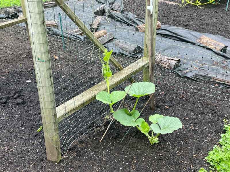 The 159 Jutras is a bit slower than her sister, but is growing well and has found the trellis.