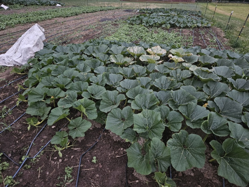 The plant on the other side of it is the 2287 Sadiq. It was starting out good, but got pretty trashed in a storm and broke the main vine. At this point it appears to be a non competitive plant and I will likely keep a few pumpkins on it.