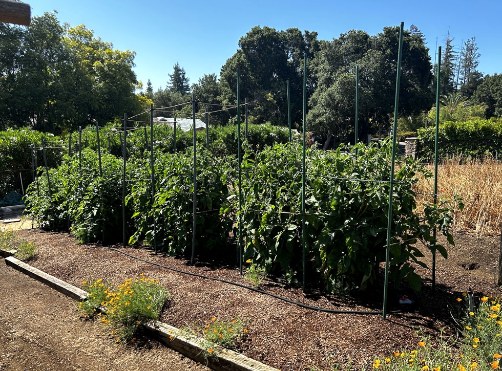 The Wall � The tomatoes have completely swallowed the tomato cages and I've got my hokey home-made supports installed to try to contain their enthusiasm. I found a few early sets about the size of apricots on the Pink Brandywines. Tomatoes eagerly promote global warming. They love the heat...