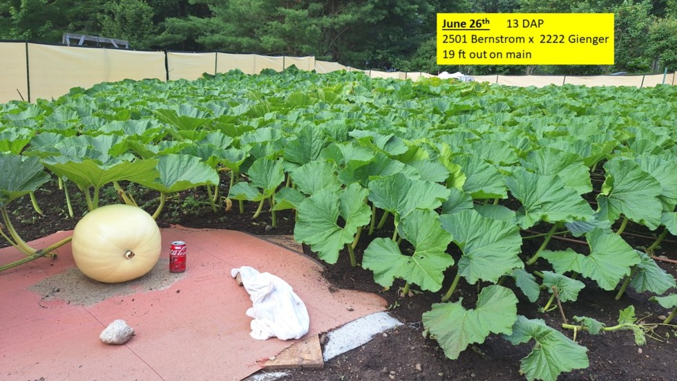 The 2501 x 2222 shown at 13 DAP will have a 1300 sq ft plant. About 2/3 of the plant has been trained and vines buried. Long way to go to finish growing this plant, then the pumpkin should kick into gear.