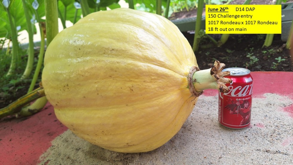 My 150 Challenge Plant. Its a 1017 Rondeau x 1017 cross. Shown at 14 DAP, at 18 ft out on the main. Should become a bright orange pumpkin