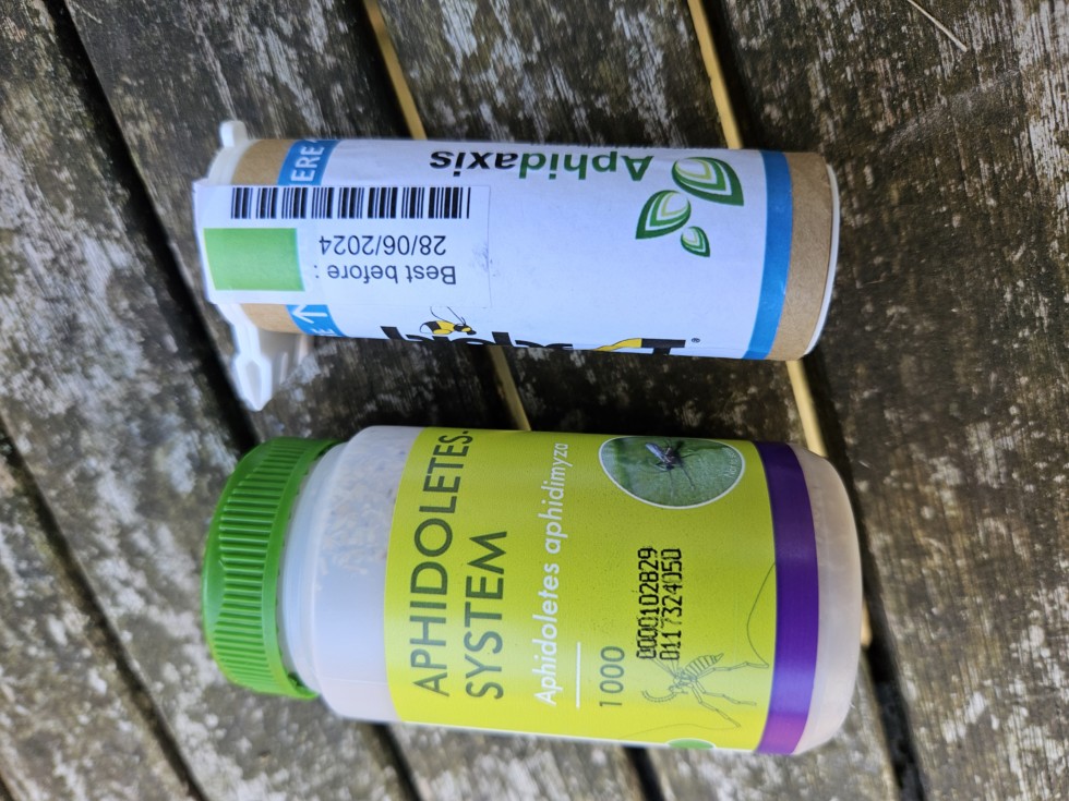 Job done ! Aphidaxis contains 6 diff�rents parasites which is perfect to cure all aphids types ( green, yellow, Black...). They will emerge in the next 7 days and start to work quickly. Aphidoletes need 10/15 days to become active but will eat all aphids strain. They can survive weeks in the polytunnel. Just need to maintain about 65% hygrom�trie.