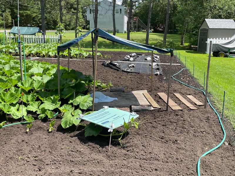 I get asked how we set up and protect our pumpkins. I don't like to have a pumpkin exposed to the sun and make a shade cover out of styrofoam as soon as it is out of the growing tip. Thanks to Eric (pumpkin pal) I got Walmart clothespins to hold foam on bamboo stakes. Once we pollinate, we build a tarp shelter with a 6-9 tarp. The base is plywood with mill fabric on top.
