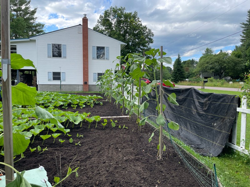 Sunflowers are stretching out nicely with the tallest around 8 feet.