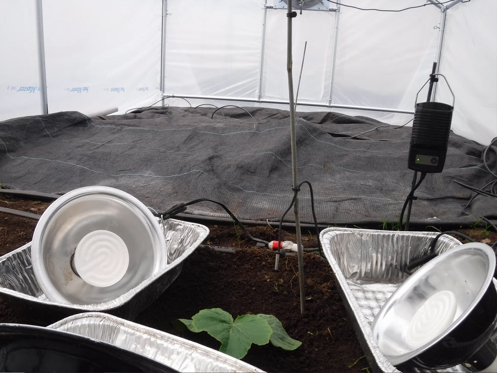 Here the placement of the reptile heat lamps and the CO2 sensor can be seen. The triangle of heaters ensures all angle are covered along with the air temperature sensor being placed in the middle and above the plant. Out of the image is a small fan to keep air circulation which is both important for the heat but also the CO2.