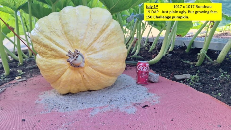 My 150 Challenge pumpkin is just plain ugly. But its appears to be growing fast though. Its a 1017 Rondeau x 1017 Rondeau cross. Shown at 19 DAP.