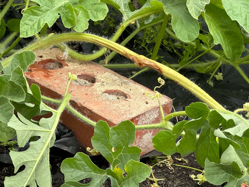 This is why the biodegradable mulch isn't very good for melons. I should have raised the vine a bit over the hole in the mulch. Cleaned and treated with fungicide. The vine with the melon of course.