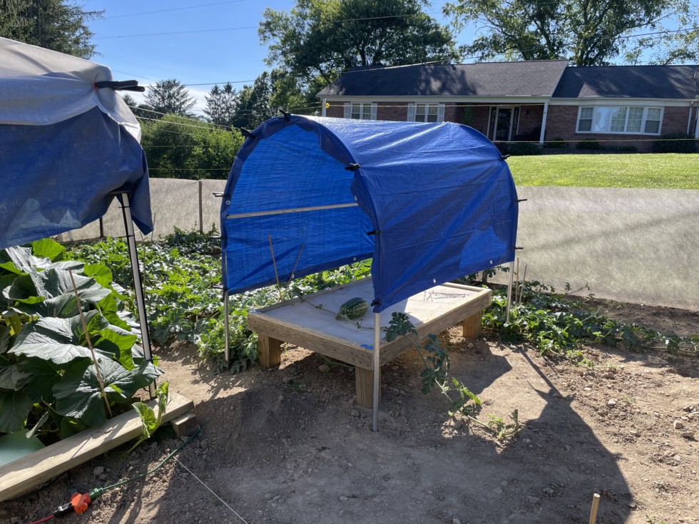 The melon set up. Hammock is made of 2x4 frame, 4x4 legs, and Mill fabric for the tabletop. The hoop structure is a metal frame repurposed from trampoline parts skinned with cheap blue tarp. Dap-8 melon taking a nap.