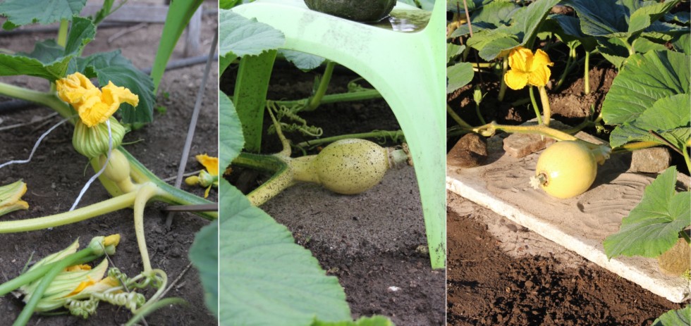 Hi there, This little baby is "Steinfriend" (2131.9 Wuersching x 636 uow Wagler), shown on day of pollination, 4 DAP and 11 DAP. What made me give that particular Jim Steinman related name to that pumpkin? There are at least three good reasons: 1) The intention...I want this fruit to grow like a "Bat out of Hell"; 2) The start into its young life...it was the first baby on the main vine ("You can�t pollinate forever, and there�s nothing wrong with getting a good head start..."), and shortly thereafter it had to struggle with awfully muddy rainy weather ("You�ve been through a lot of rain in the dirt, and I know you�ve got the splashes to prove it..."); 3) Honestly, who wouldn�t like to have a dear Steinfriend nearby, one you can visit every day and ask "How are you doing?"