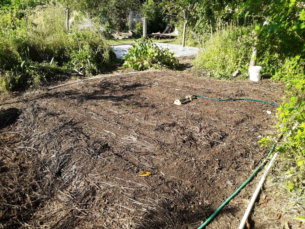 The solarized area is now carrots. It got hot enough to cook some garlic bulbs. Probably killed a lot of the good soil biology, so I added a thin layer of good compost and watered it in. Having the ground be warm might help the carrots germinate. The water from the well is 40 degrees. Mix that with dirt that is still 80 degrees... it comes out about right. Now is the ideal time to plant carrots because they get to a nice size and good quality and then they can store in the ground overwinter. Same for beets.