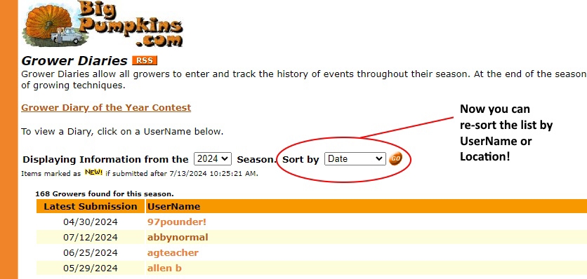 For the July 2024 update to the website, I have added the ability to re-sort the list of Grower Diaries by UserName, Location or Date.