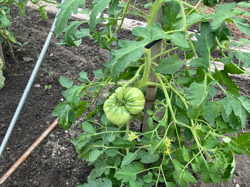 The first tomato to be supported this year is off the 7.11 LaRue and has a circ of 15.75 inches today.