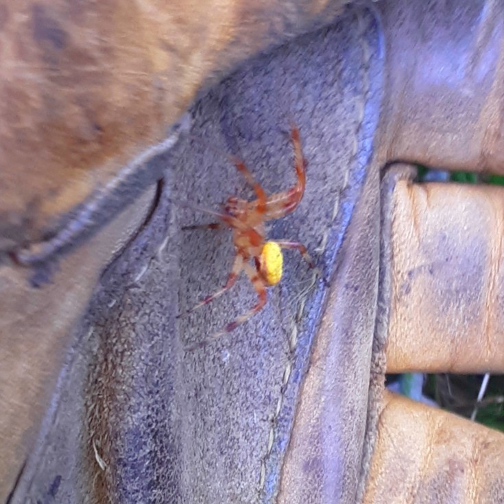 This is a species Ive never seen. Pretty sure its a garden spider x yellow crab spider. I saw another hybrid spider a long time ago, it was bizarre. Kinda sad since nature doesnt have much kindness towards oddballs but I wish it the best. If it leaves me alone I will leave it alone.