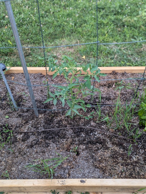 3.90 Luers plant. My personal seed. This plant has been a bit slow getting started. We will see. I didn't till up the ground right here since there was already a very short raised bed. I have a suspicion the roots might be having a harder time getting through the soil. Who knows. What I did find today was a fantastic Megabloom on it today.