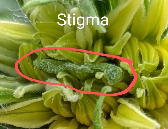 You'll notice the stigma on this Megabloom is not as nice as the last one. It has three sections. You can see I've placed pollen on all three sections. It's really a pain if the sections don't all pollinate at the same time. You get one part of your giant tomato ripe and the other section still green.