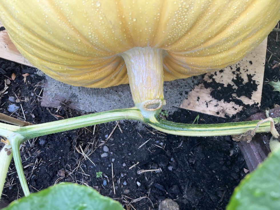 Much better now. I pulled a bit of the main past the pumpkin out to the garden's border to create more space and reburied roots. I carefully moved the pumpkin too and up to three bricks on each side. It's a tight spot with the wooden border and the main curving. Is there anything I should be concerned about with the vine angles at the stem?