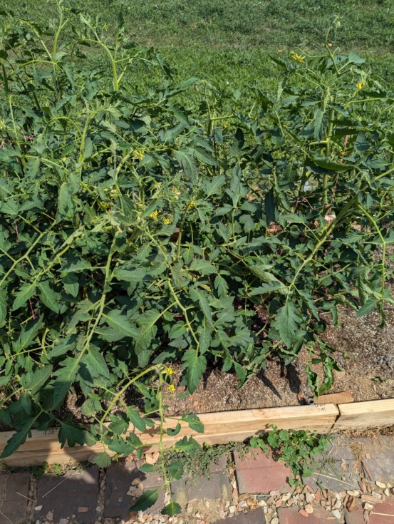 7.94 LaRue growing gangbusters. Hard to keep all the suckers pruned. I will have to make a decision on the two maters growing on it soon. It has grown into the Brown plant and it's hard to see where one quits and the other begins. It didn't help one leaned left and the other right. Go figure. Lol