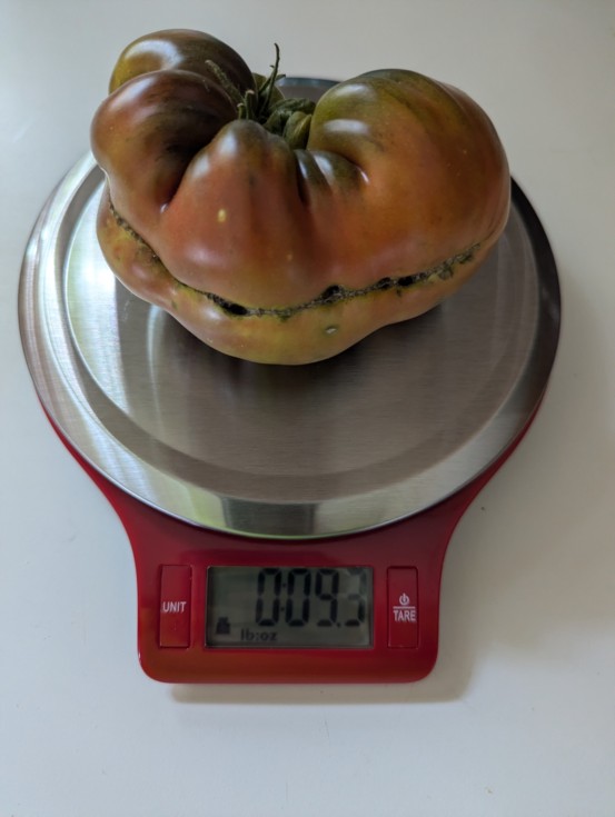 Omg 9.3 poun..... wait......ounces.......:) it's funny how much this looks like a giant tomato in miniature. Not too surprising since it was a really good Megabloom on the Cherokee purple. You can see it somewhere earlier in my diary.
