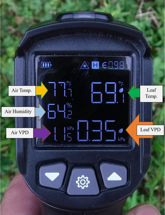 VPD Thermometer, Handheld Environmental Monitor, Captures Leaf VPD and Temperature : https://acinfinity.com/content/TRV2404X1_240422_VPD%20Thermometer%20Manual.pdf?_ga=2.225954714.1886154692.1720723688-1452909769.1718573613&_gac=1.229322280.1719705546.EAIaIQobChMInI2-rIKChwMVTmFHAR0JjQVMEAQYASABEgKh__D_BwE