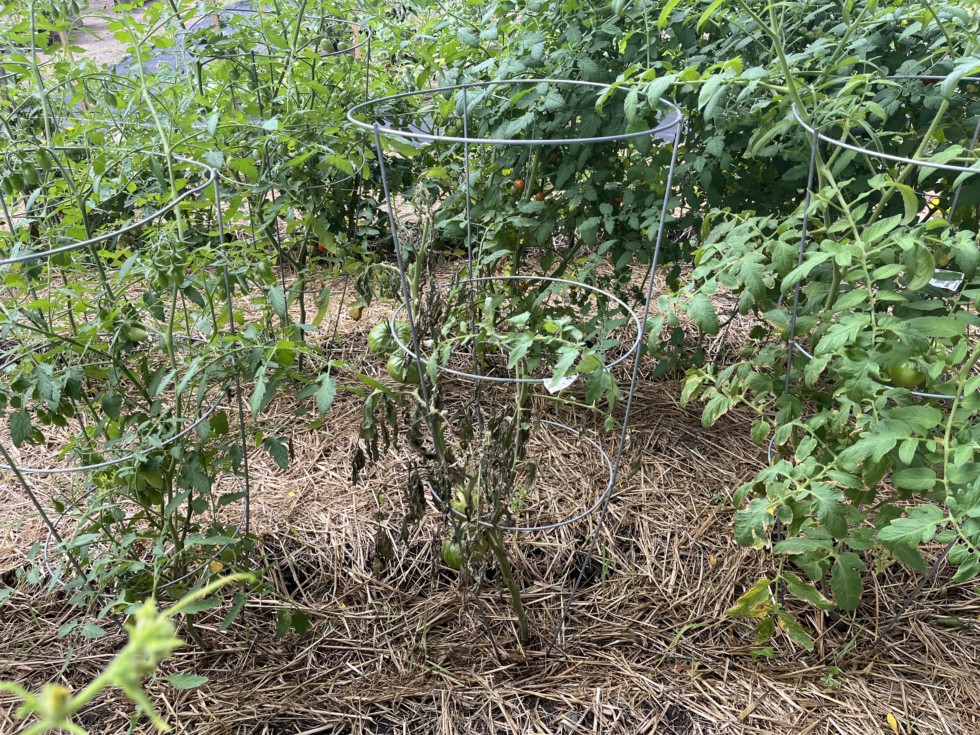 The struggling tomato is an Heirloom Pink Berkley Tye Die. We grew one last year, and have four this year that we started from seed. They are all struggling while all the other tomatoes are doing well. A couple online forums say they don't do well in the heat.