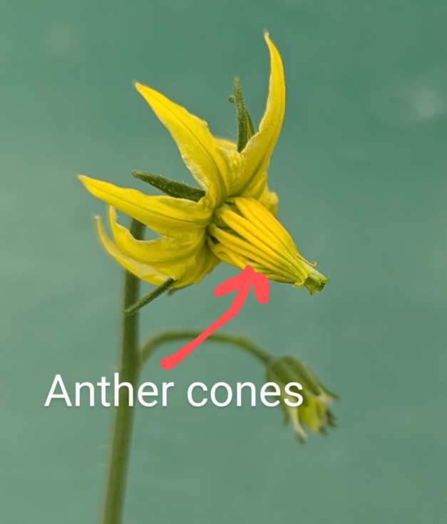 Here is a good example of why Megablooms have problems pollinating and why hand pollination is so important. This is a normal tomato flower I cut off today. You can see the anther cones are tightly bound to the style and stigma (female flower part) The pollen is released by the anther cones inside and has to travel down the anther cones and go right by the stigma (the green tip and the end of the anther cones) now let's look at another flower that is more like a Megabloom in the next entry