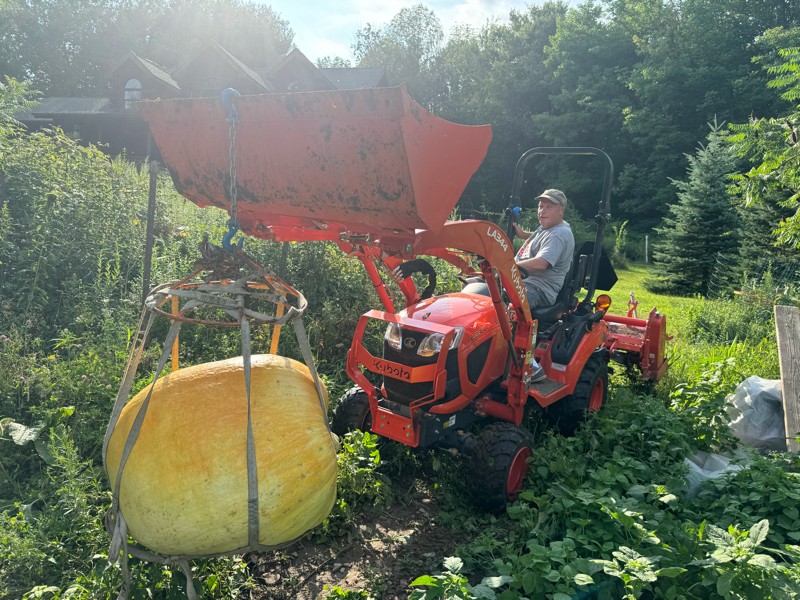 It's that time of year when our local Wayne County Fair signals the bell that summer is officially flying by. It has been a while since I entered a pumpkin in the largest vegetable division so I had an extra one on the 1864 Toboyek that needed to be culled so the Kubota was fired up for a pumpkin lift.