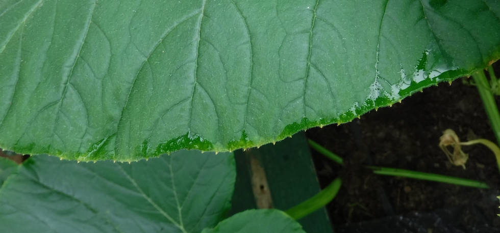 Here is a close-up of the leaf margin and it shows a more even spread of the water in the edge of the leaf which is more typical. In general, the cause of the even water distribution is the same as the more pronounced droplet condition and this is the area that the leaf edge burn will occur and this is why it is typically seen as an even (but thin) line along the perimeter of the leaf.