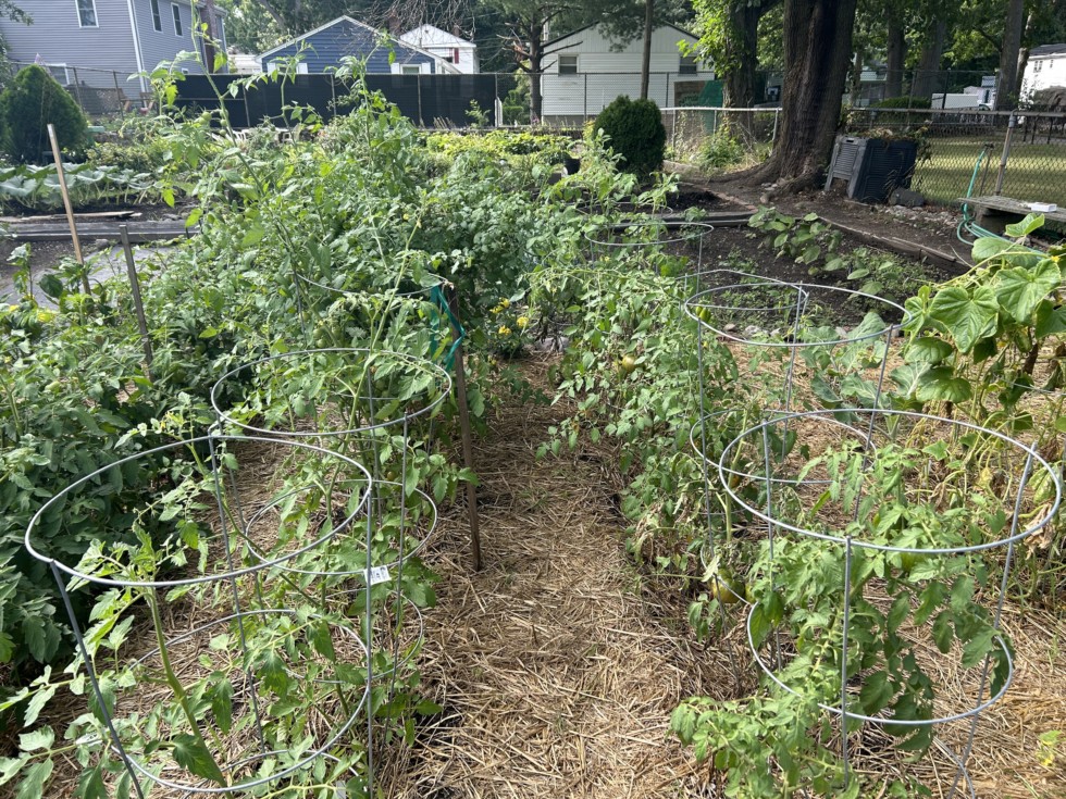 Our plots held up better than expected over the last few days with all the rain and east winds. East winds blow over the park and right through the chain link fence. I carefully adjust the tall tomatoes to prevent them from getting too close to our Celebrity row.