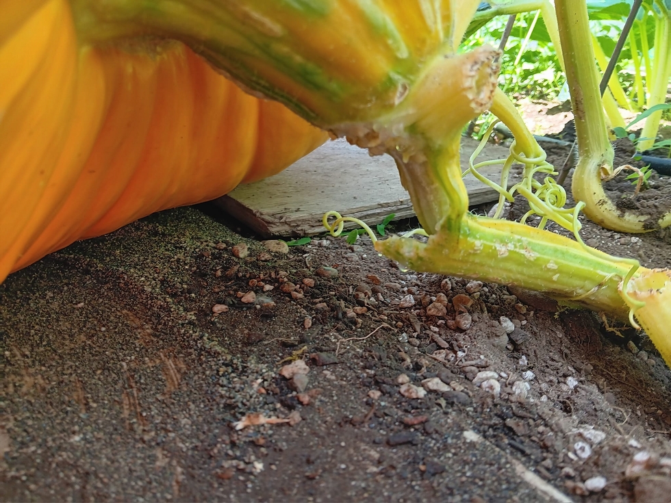 After cleaning things up, I have about half the diameter of the vine intact. I dusted it with some sulfur. I am hopeful that the Pumpkin will survive but I doubt it will be able to grow as much as it could if undamaged.