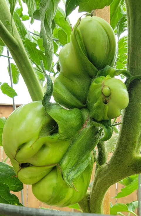 The wacky "Van Gogh" bloom, still growing. Seed tomato.