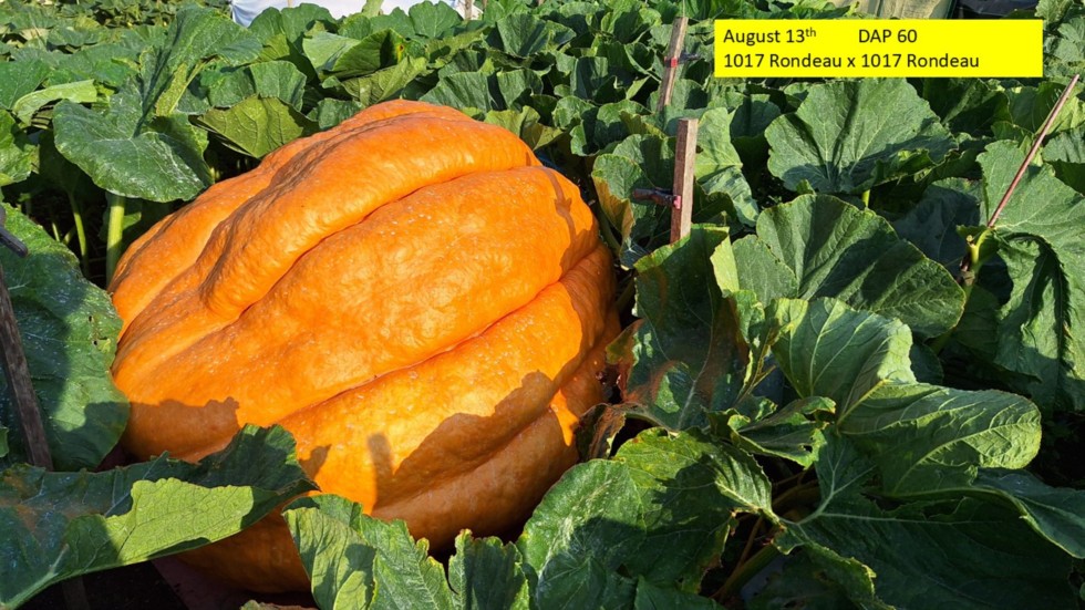 My 150 pumpkin (1017 Rondeau x 1017 Rondeau) is at DAP 60 and very slowly still adding weight. Averaging 13.3 lbs per day for the last 10 days. The bright Orange Color is just what I wanted in this pumpkin.