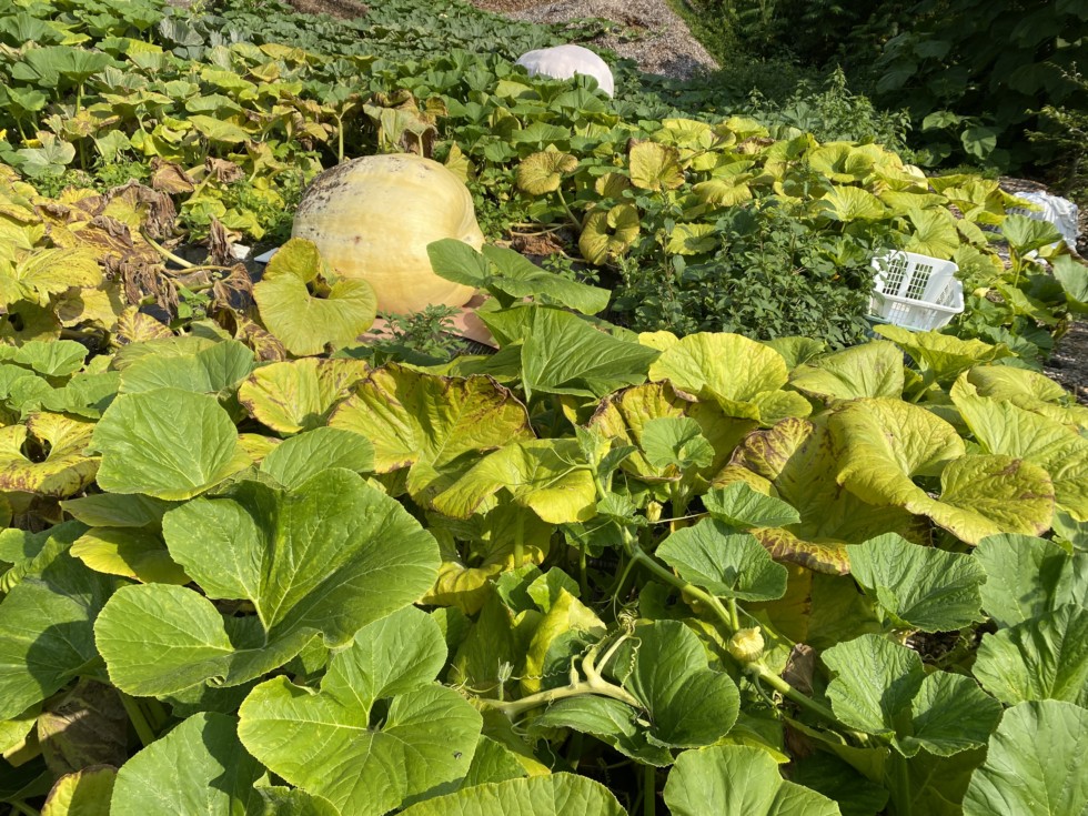 Another photo of the 1908 Connolly. The way the disease progresses is that it goes in sections. On the front end of the plant by the stump, the pumpkins are still setting and growing. It usually is only a matter of time before the disease catches up to it and you will see those abort and rot just like the big one in the previous photo.