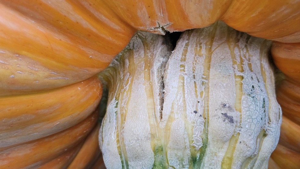 The crack Barron 2404. The pumpkin crack has not moved since surgery. The stem crack is widening as the pumpkin grows. From this picture, you can see that the point of the crack is going in different directions. I'm going to extend the crack another 1/2 ".