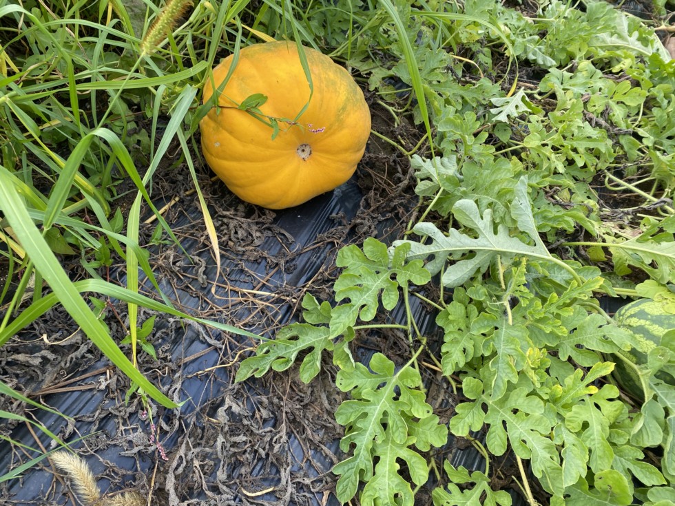 It looks like a field pumpkin that's starting to ripen. Nope� It's a royal golden watermelon. They turn bright yellow when they're ready.