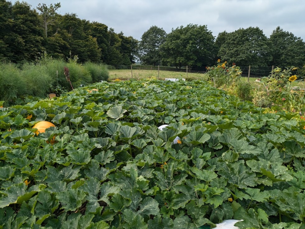 Patch has filled up nicely. The orange pumpkin in the foreground is the 2045 Daho. The one in the middle under a white sheet is the 144 Crews field pumpkin, currently estimating 165 pounds. Unfortunately it has started to turn orange already so I'm not sure how much more it will gain.