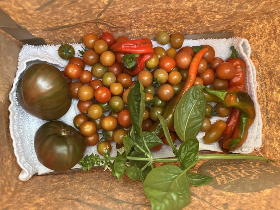 Veggie garden harvest tonight. So glad we did six cherry tomato plants. Hopefully with the warmer weather coming many of the large tomatoes ripen and the pumpkin continues to grow as well.