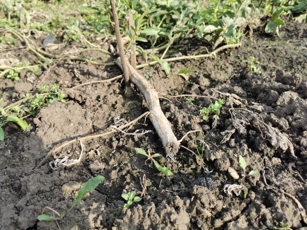 A stump rotted on the Carolina Cross watermelon more than two weeks ago, which I cut off. I also removed about a third of the green mass, which stopped coming into contact with the watermelon.