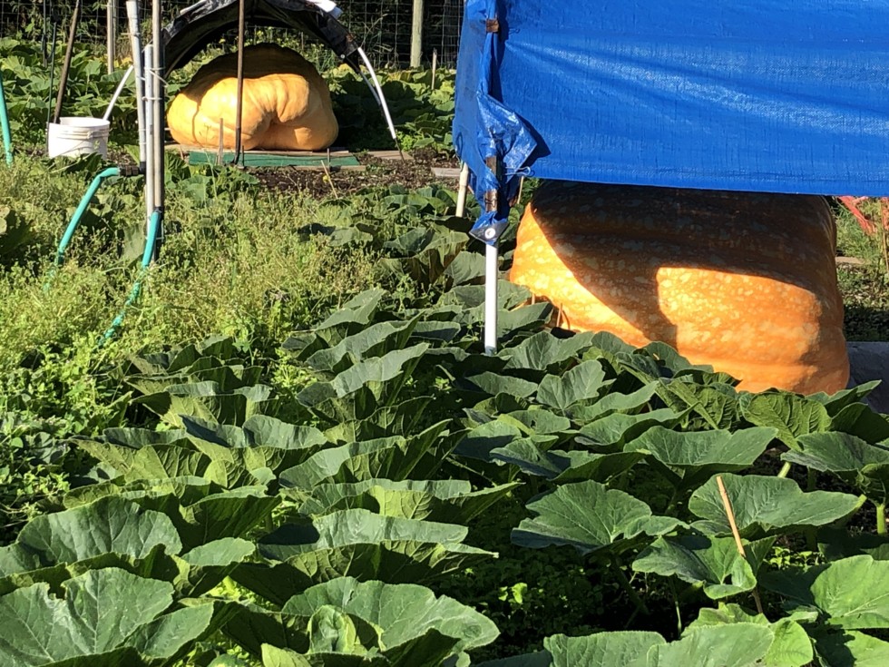 Day 75 for the nice orange pumpkin on the 839 Sandercock and day 62 on the getting more orange every day 1995.5 Hoornstra pumpkin at the top. Weather appears to be improving for the next 14 days and if there is no threat of rain, I'll likely remove the roof covers on the hooptie houses and let the sun heat up the pumpkins again. It's been so cool and wet here, the core temperature of everything has fallen, so time to warm things up. After collecting some heat during the day, we will cover them again with quilts to hold in some heat during our cool evenings.