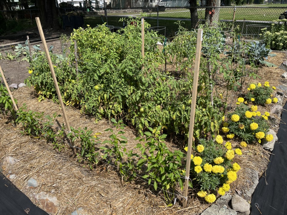 Mandatory corner shot of the veggie garden. Trench watered today.