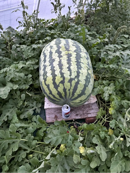 Crawled in and remove a bunch of small melons. Still have 3 big ones. This is the biggest. The rest are much younger.